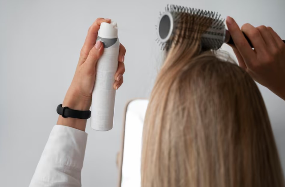 Баллончик держат на расстоянии 20-30 см от прически. При распылении надо не задерживаться надолго в одной точке, а совершать плавные движения. Это нужно, чтобы не вышло избытка средства в одной точке.